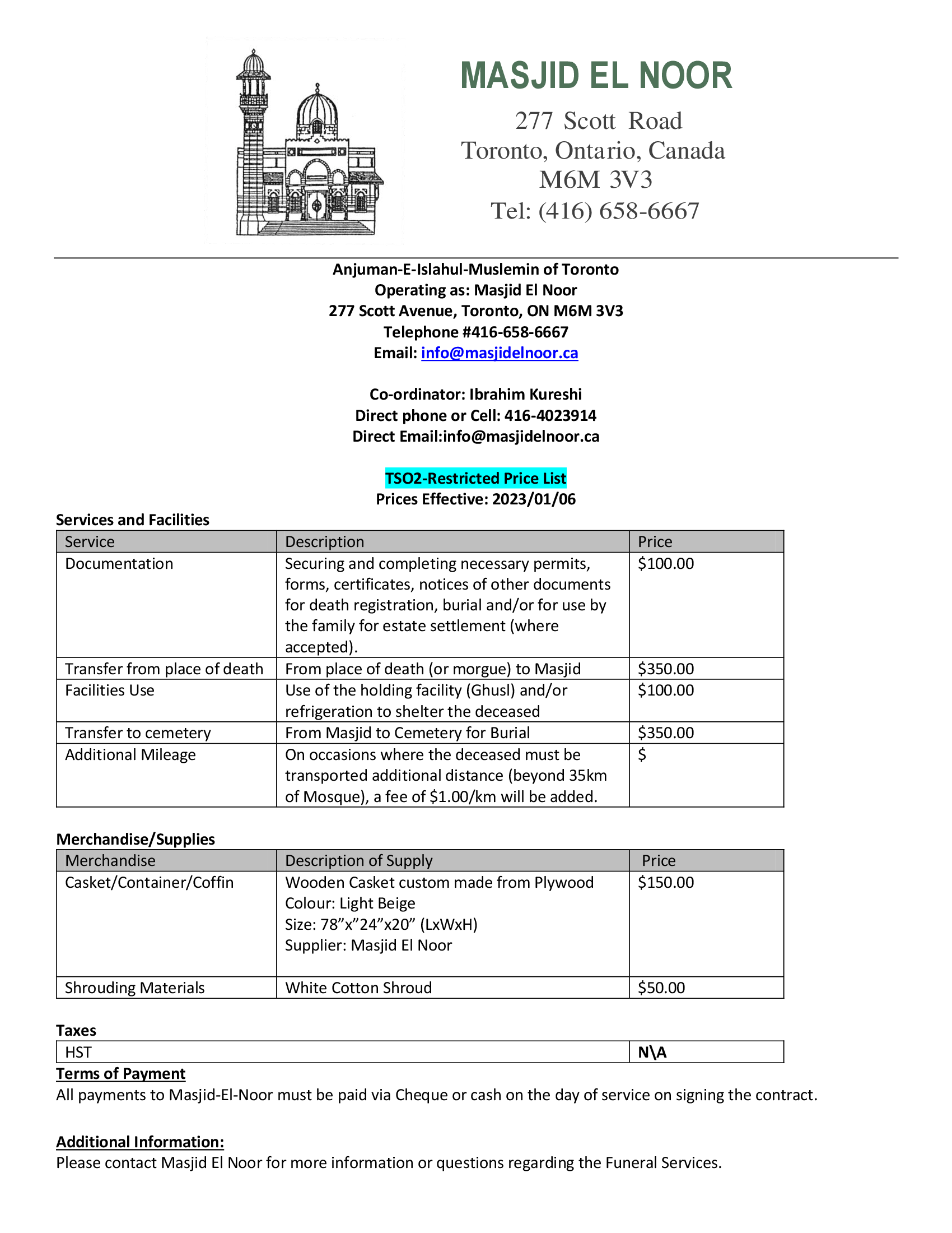 Payment shall be made at the time of signing the contract. Payment shall be made by debit or credit card as well as cash or cheque made payable to “Anjuman-E-Islahul-Muslemin Of Toronto” or “Masjid El Noor”. Additional information is available upon request.